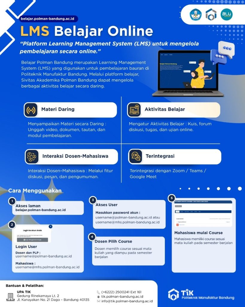 Belajar Polman Bandung merupakan Learning Management System (LMS) yang digunakan untuk pembelajaran bauran di Politeknik Manufaktur Bandung. Melalui platform belajar, sivitas akademika Polman Bandung dapat mengikuti berbagai aktivitas belajar secara daring.